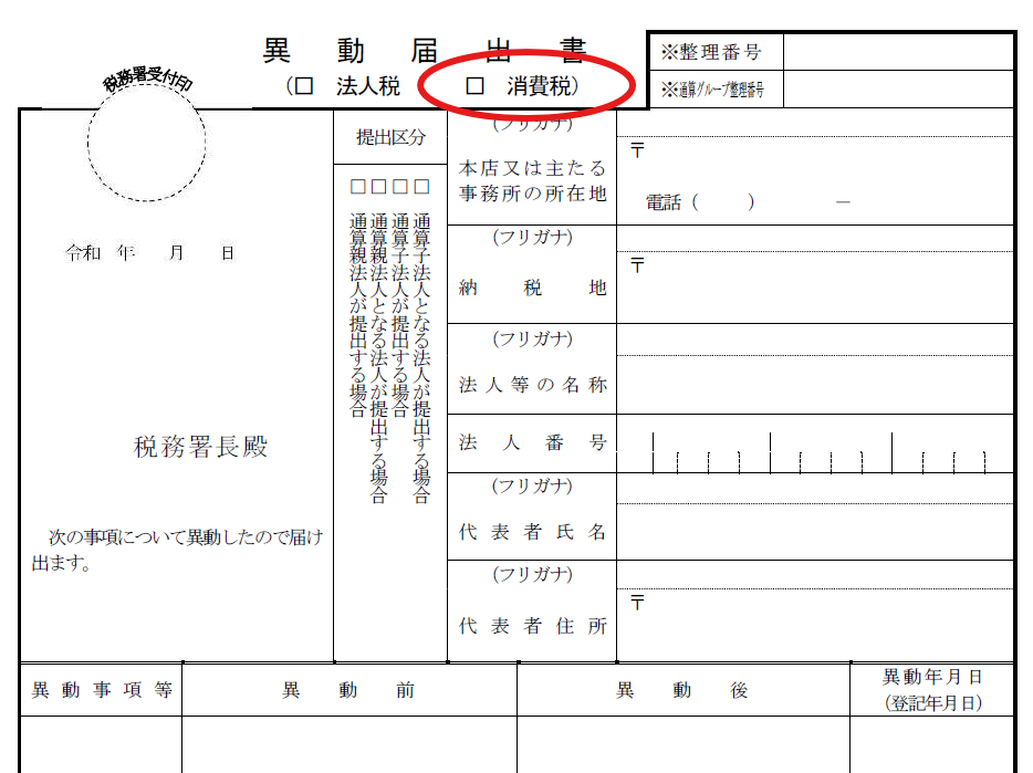 消費税法上、法人は、その資産の譲渡等に係る消費税の納税地に異動があった場合には、原則として、遅滞なく、その異動前の納税地(※2)を所轄する税務署長に、異動前の納税地及び異動後の納税地等を記載した書面(法人の消費税異動届出書)によりその旨を届け出なければならないと定められています。